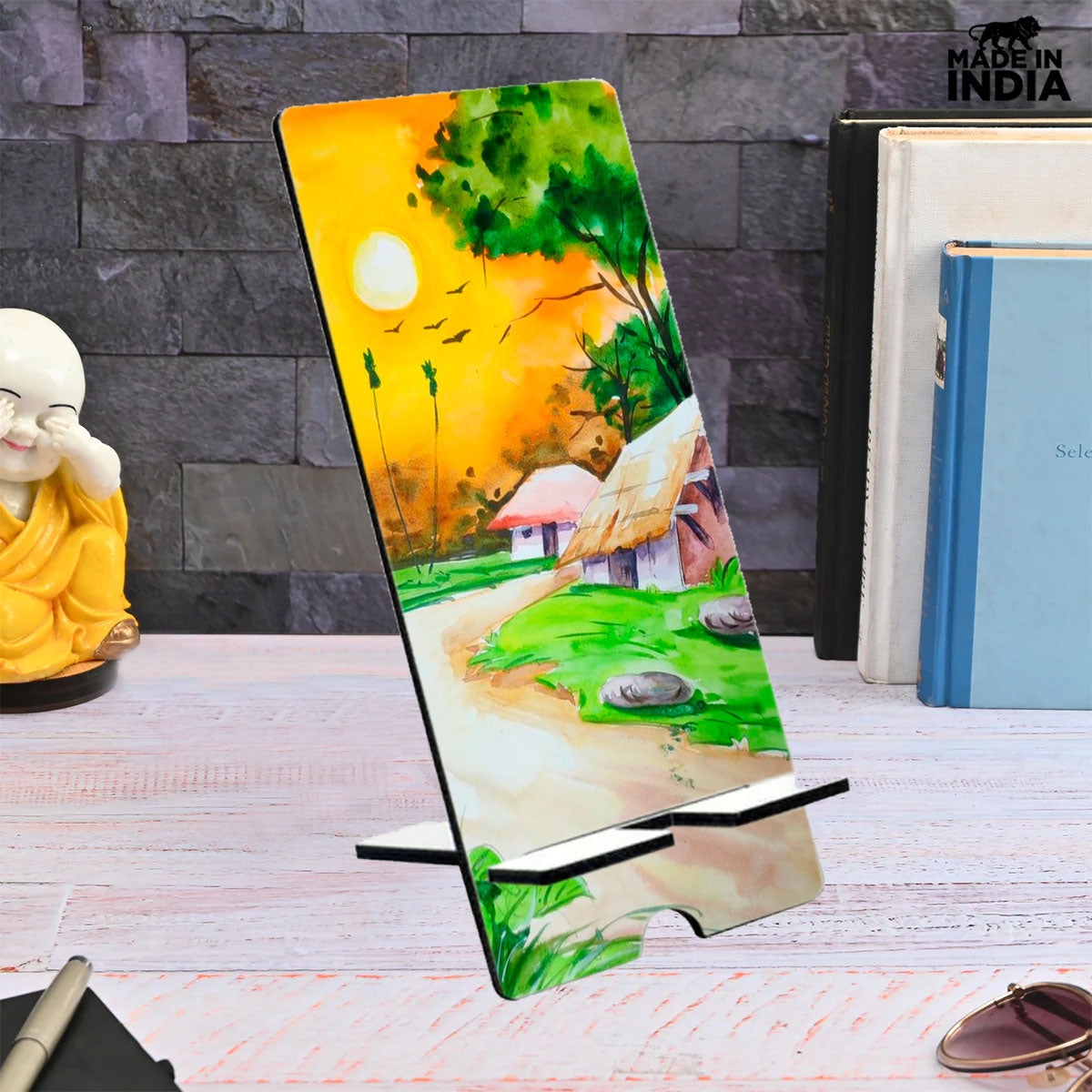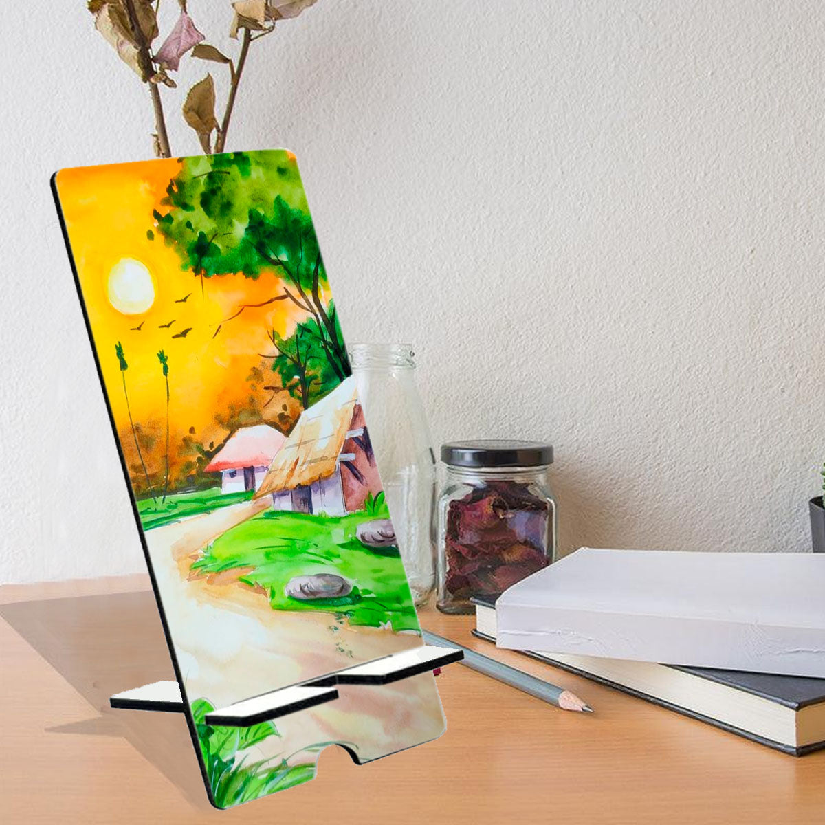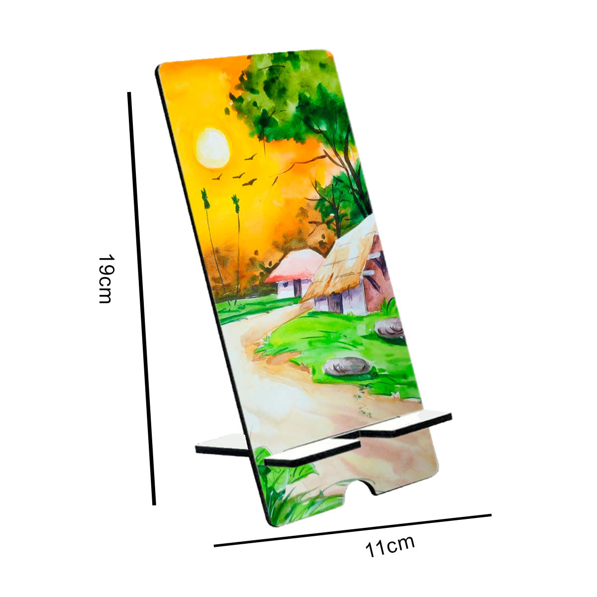 MDF Wooden Mobile Stand. Made 5MM MDF, Durable, Sturdy, Strong MDF Wood and Looks Great. Various Variety of Beautiful Design and Multicolour. Mobile Stand Simple, Stylish and Elegant Looks without Losing the Atmosphere, Compatible with all Smartphones. Multi-Function & Multipurpose-Right Height, Sturdy Enough, Perfect Viewing angle when Watching Videos, Easy to Watch Videos, Read Messages, Cook in Kitchen, Email, Online Recipes, YouTube Video, Online Classes. Delightful Desk Accessories: Made of Using Light Weight Wood, Smooth Finish is Very Unique and Longer Life of Wood and Very Useful Product to Keep Your Phone/Mobile Safe at Home, Office, or Bed Side While Sleeping. Your Home, Kitchen, Nightstand, Dining Table. Best Office Table Accessories.