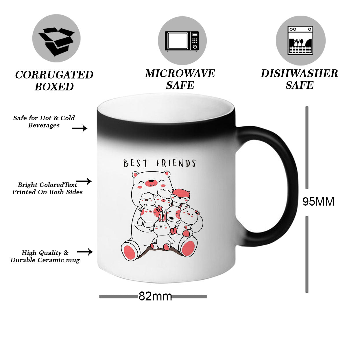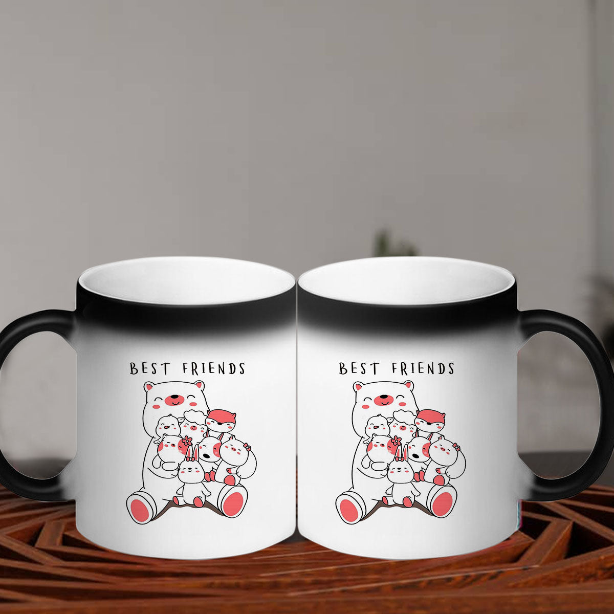 When your friend pours a hot beverage, such as coffee, tea, or hot chocolate, into the mug, an extraordinary transformation takes place. Like a magical spell, the black exterior of the mug starts to fade away, revealing a hidden design underneath. It could be a heartwarming message, a beautiful friendship quote, or even a personalized photo of you and your friend together.