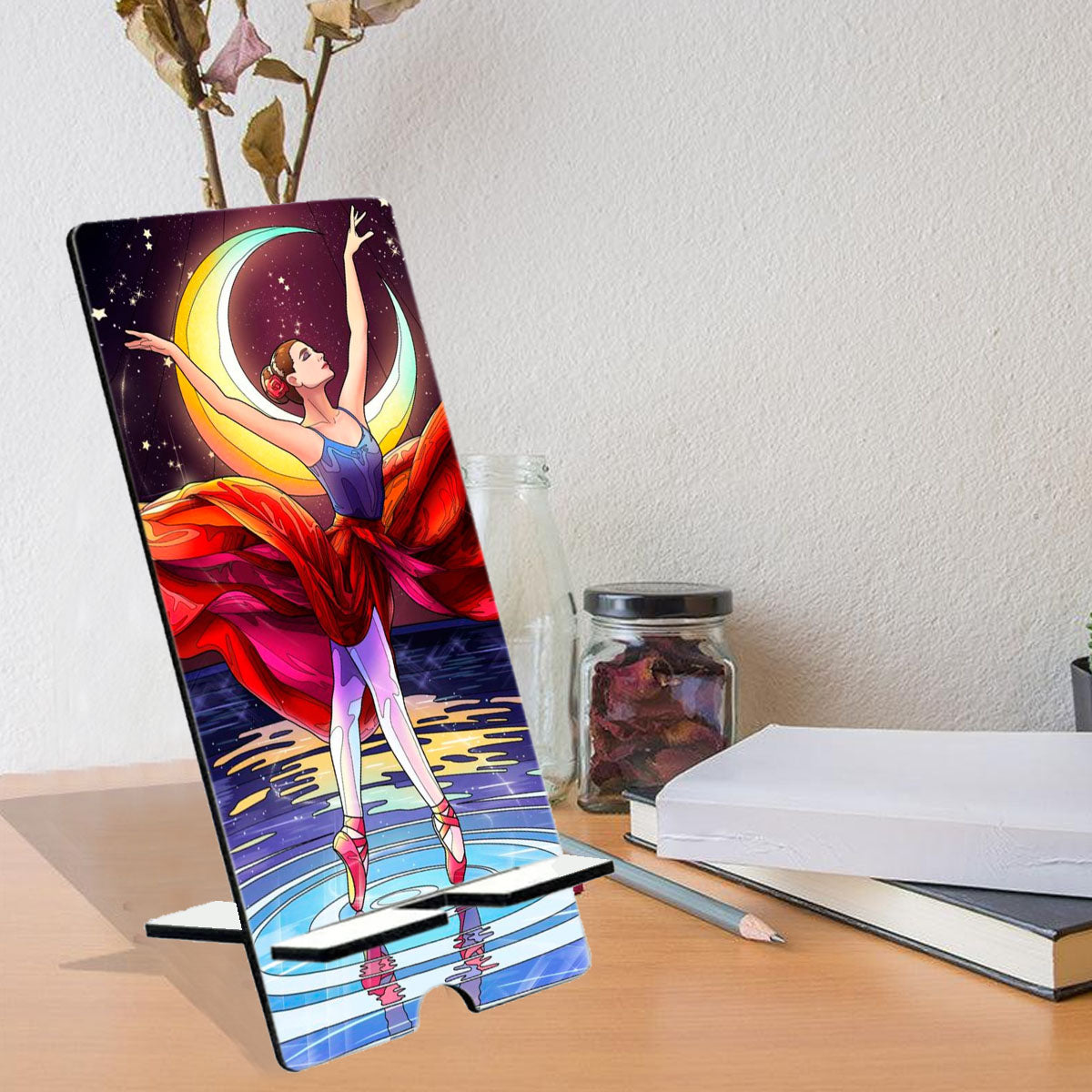 MDF Wooden Mobile Stand. Made 5MM MDF, Durable, Sturdy, Strong MDF Wood and Looks Great. Various Variety of Beautiful Design and Multicolour. Mobile Stand Simple, Stylish and Elegant Looks without Losing the Atmosphere, Compatible with all Smartphones. Multi-Function & Multipurpose-Right Height, Sturdy Enough, Perfect Viewing angle when Watching Videos, Easy to Watch Videos, Read Messages, Cook in Kitchen, Email, Online Recipes, YouTube Video, Online Classes. Delightful Desk Accessories: Made of Using Light Weight Wood, Smooth Finish is Very Unique and Longer Life of Wood and Very Useful Product to Keep Your Phone/Mobile Safe at Home, Office, or Bed Side While Sleeping. Your Home, Kitchen, Nightstand, Dining Table. Best Office Table Accessories.