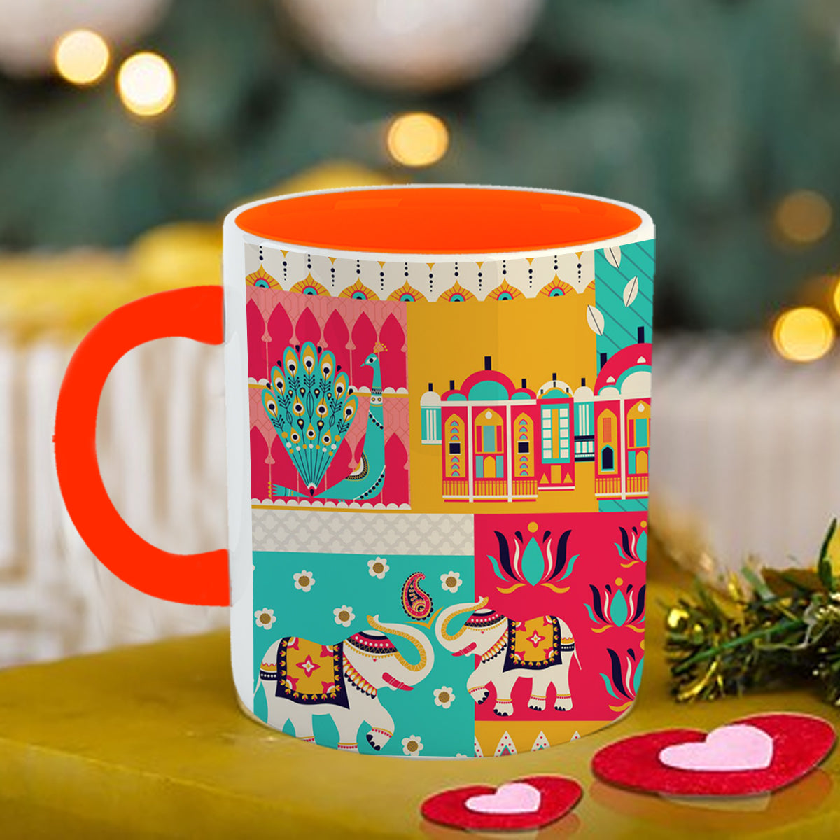 Inner Colour Mug: Start your day with a touch of vibrancy. This mug, adorned with a traditional Diwali design, features an inner color that adds a pop of brightness. It's perfect for sipping your morning chai or coffee as you bask in the Diwali glow.