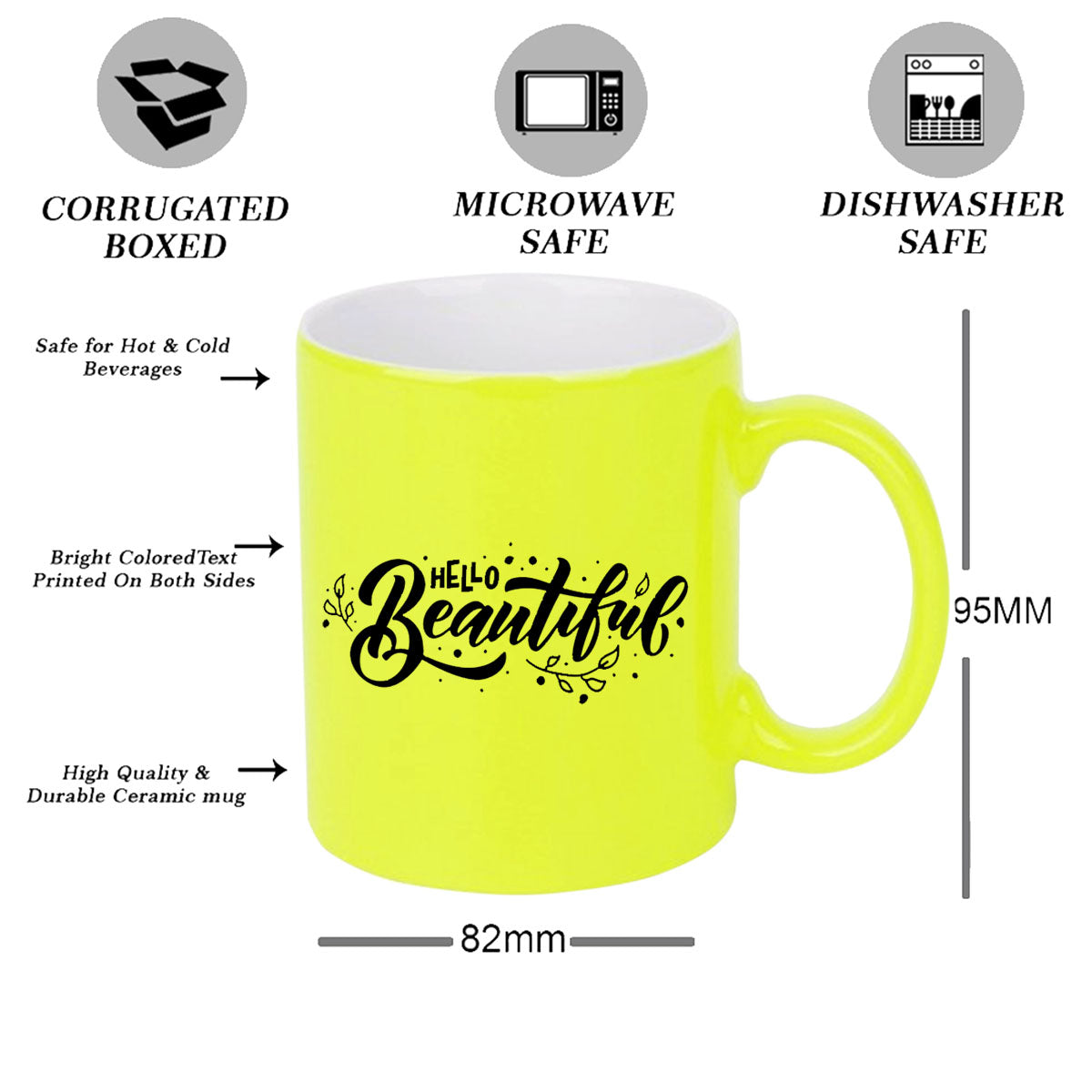 “Isn't it amazing how the world begins to change through the eyes of a cup of coffee”, why not to change it with a better start. Chill-aao.com let you shift from the regular coffee mugs to the newly introduced collection of Neon color mugs. The bright radiant colors are an absolute eye-catcher. The unique, quirky and funny prints guarantee to bring smile to your loved ones. Gift it to your friends, mom, dad, brother, sister, grandfather, grandmother, colleagues, cousins, girlfriend, boyfriend. Caters to all the important occasions of your life like birthdays, anniversaries, special days like friendship day, mother’s day, father’s day, valentine’s day, also can be gifted as a return gift. The mugs are made of white hard ceramic and are designed using the sublimation technology with the finest quality ecofriendly inks. The prints are scratch resistant and do not fade or come out with time and use. The size of the mug is perfect to accommodate a perfect amount of tea/coffee to start your day with. The product is printed against your order. The actual print may vary.