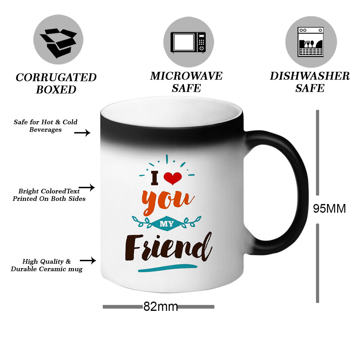 When your friend pours a hot beverage, such as coffee, tea, or hot chocolate, into the mug, an extraordinary transformation takes place. Like a magical spell, the black exterior of the mug starts to fade away, revealing a hidden design underneath. It could be a heartwarming message, a beautiful friendship quote, or even a personalized photo of you and your friend together.