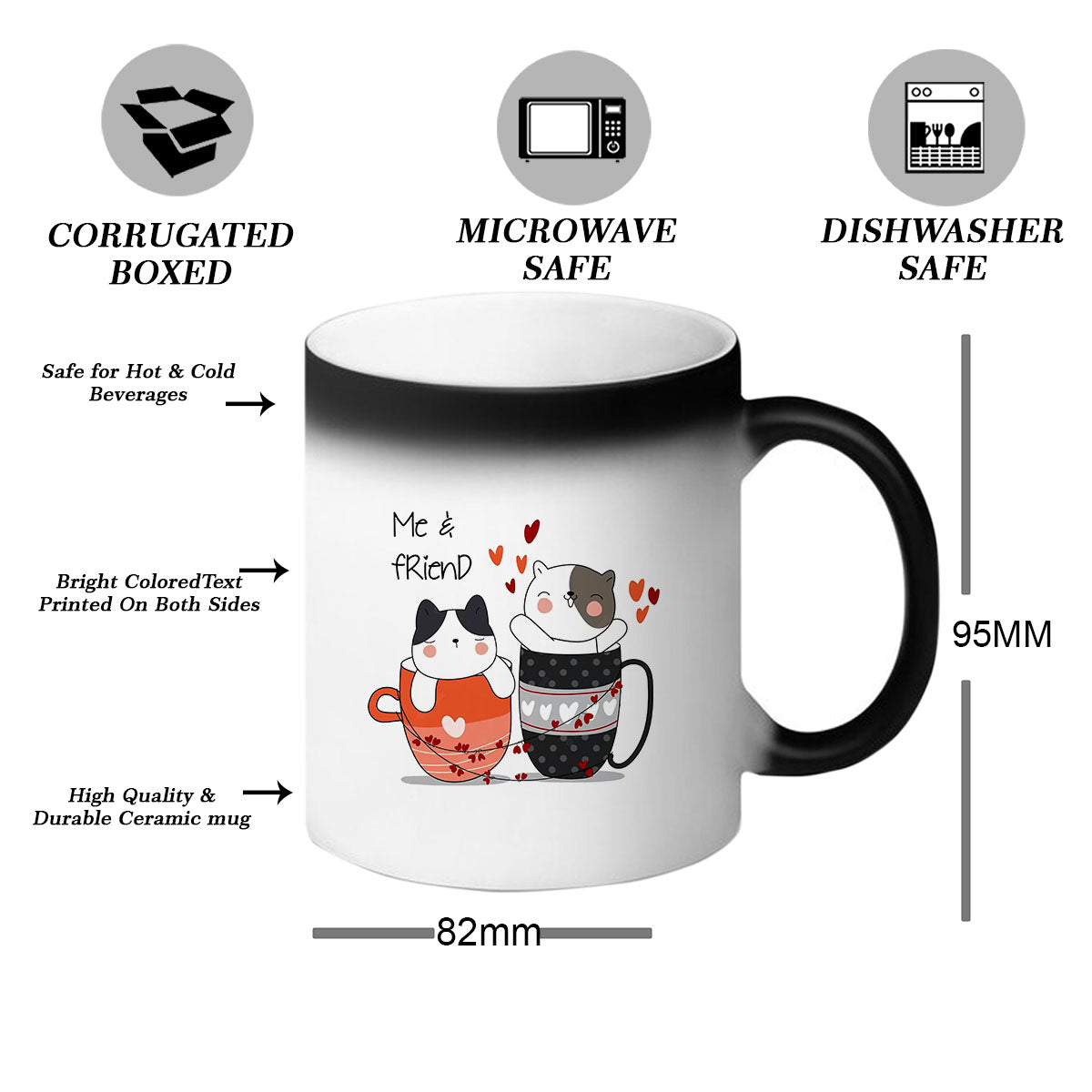 When your friend pours a hot beverage, such as coffee, tea, or hot chocolate, into the mug, an extraordinary transformation takes place. Like a magical spell, the black exterior of the mug starts to fade away, revealing a hidden design underneath. It could be a heartwarming message, a beautiful friendship quote, or even a personalized photo of you and your friend together.