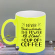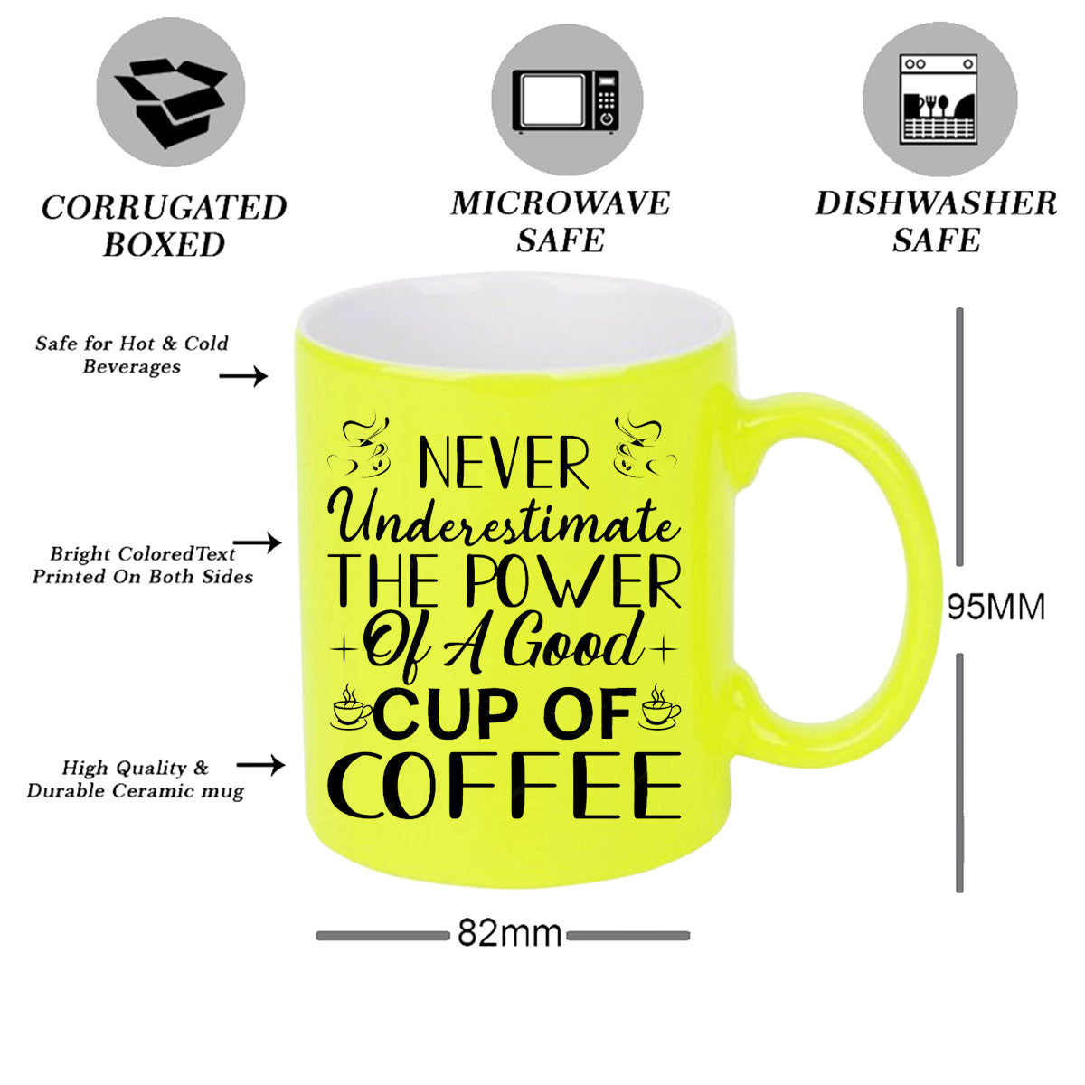 “Isn't it amazing how the world begins to change through the eyes of a cup of coffee”, why not to change it with a better start. Chill-aao.com let you shift from the regular coffee mugs to the newly introduced collection of Neon color mugs. The bright radiant colors are an absolute eye-catcher. The unique, quirky and funny prints guarantee to bring smile to your loved ones. Gift it to your friends, mom, dad, brother, sister, grandfather, grandmother, colleagues, cousins, girlfriend, boyfriend. Caters to all the important occasions of your life like birthdays, anniversaries, special days like friendship day, mother’s day, father’s day, valentine’s day, also can be gifted as a return gift. The mugs are made of white hard ceramic and are designed using the sublimation technology with the finest quality ecofriendly inks. The prints are scratch resistant and do not fade or come out with time and use. The size of the mug is perfect to accommodate a perfect amount of tea/coffee to start your day with. The product is printed against your order. The actual print may vary.