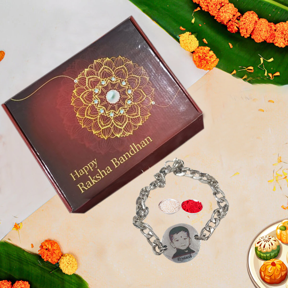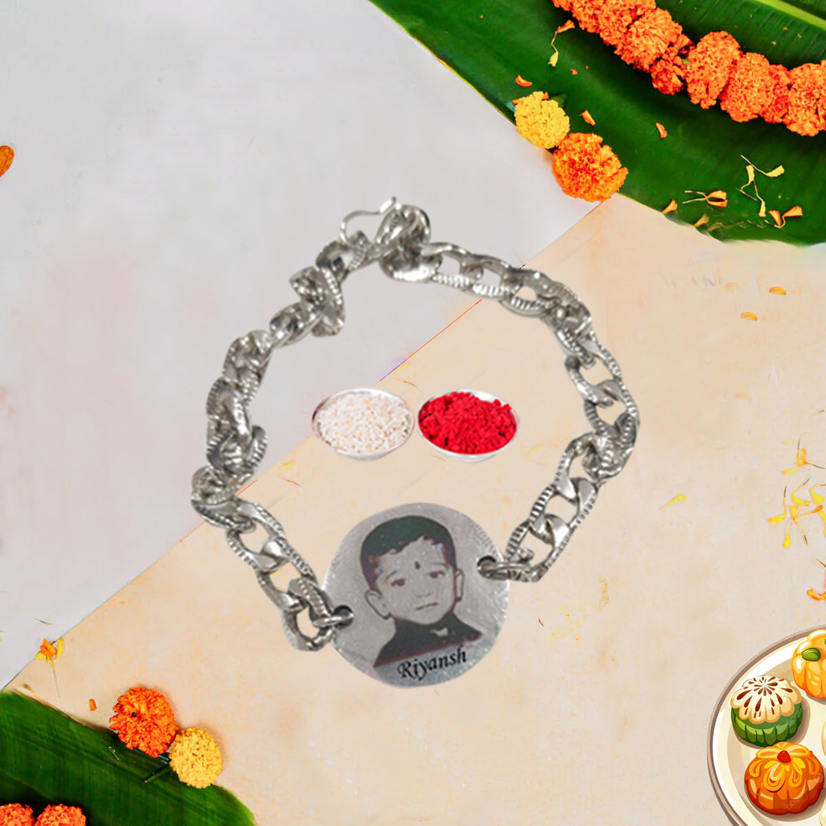 Celebrate sibling love with elegance and emotion! Our Personalized Metal Photo Rakhi features your chosen photo laser-engraved on a premium metal base, giving it a rich, polished look that lasts forever. The rakhi is tied with soft, colorful threads and comes with festive packaging – a perfect blend of tradition and sophistication.