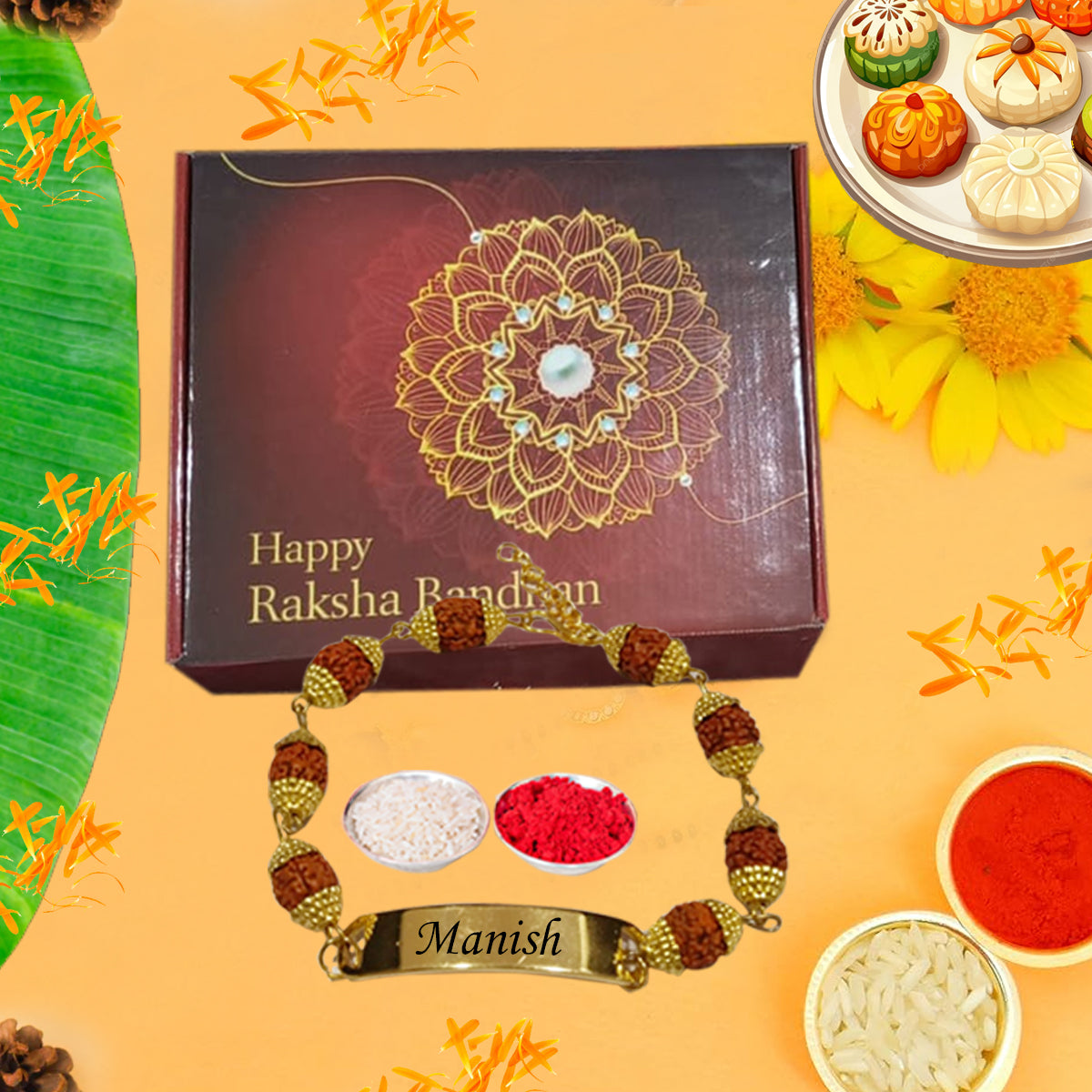- Rudraksha Rakhi: The centerpiece of the hamper is usually a beautiful Rakhi, which is a decorative thread that symbolizes the bond of love between siblings. Rakhis come in various designs, materials, and styles, catering to different preferences.