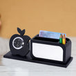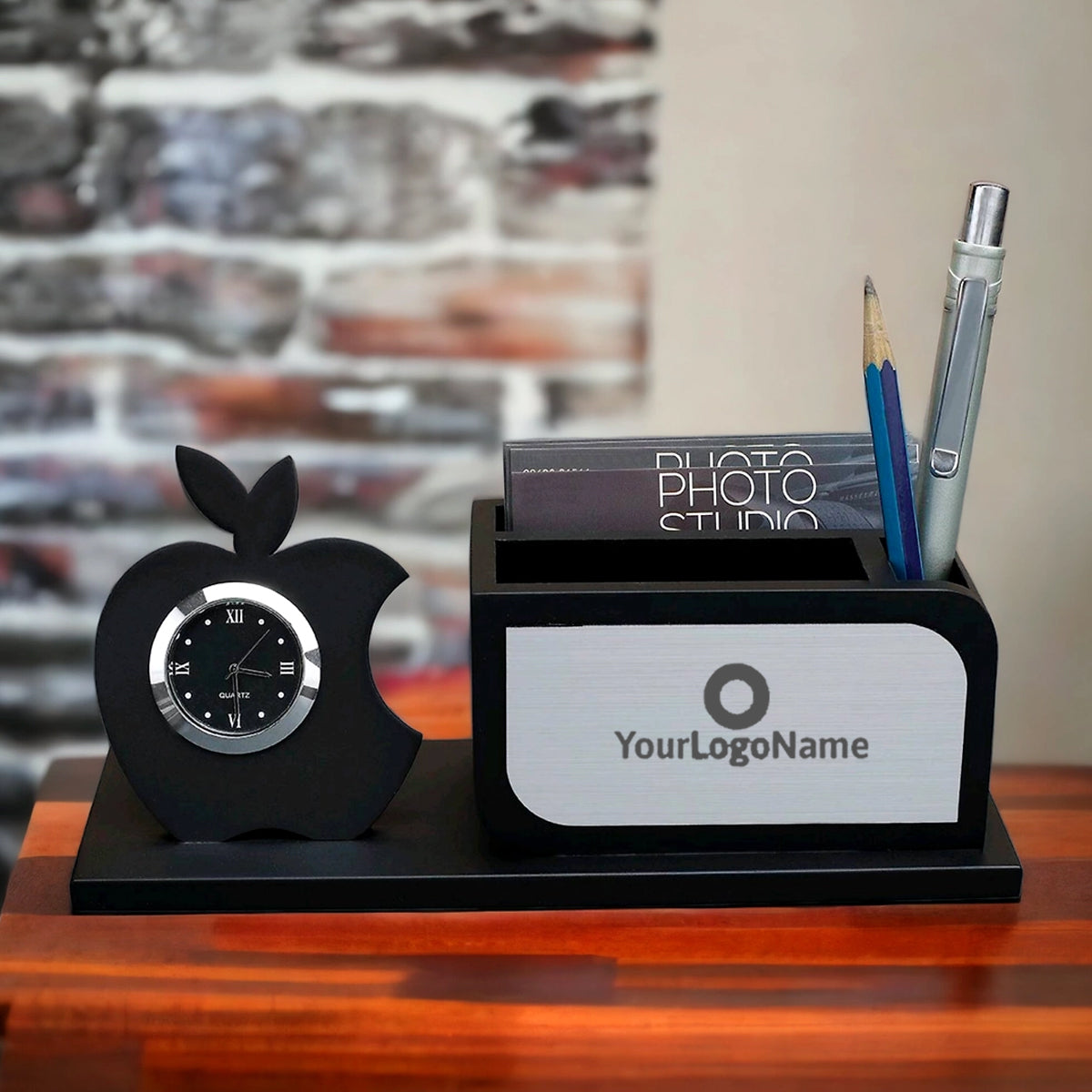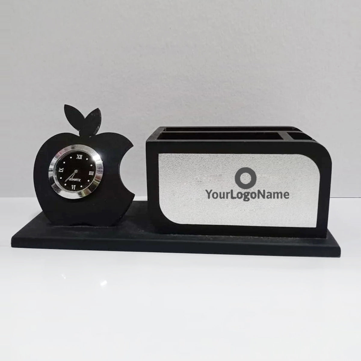 Wooden Black Pen holder and organizer with watch, with Golden acrylic sheet, can be engraved your name or company logo or as per requirement. Keep pen, pencil, visiting card, mobile, pins etc