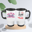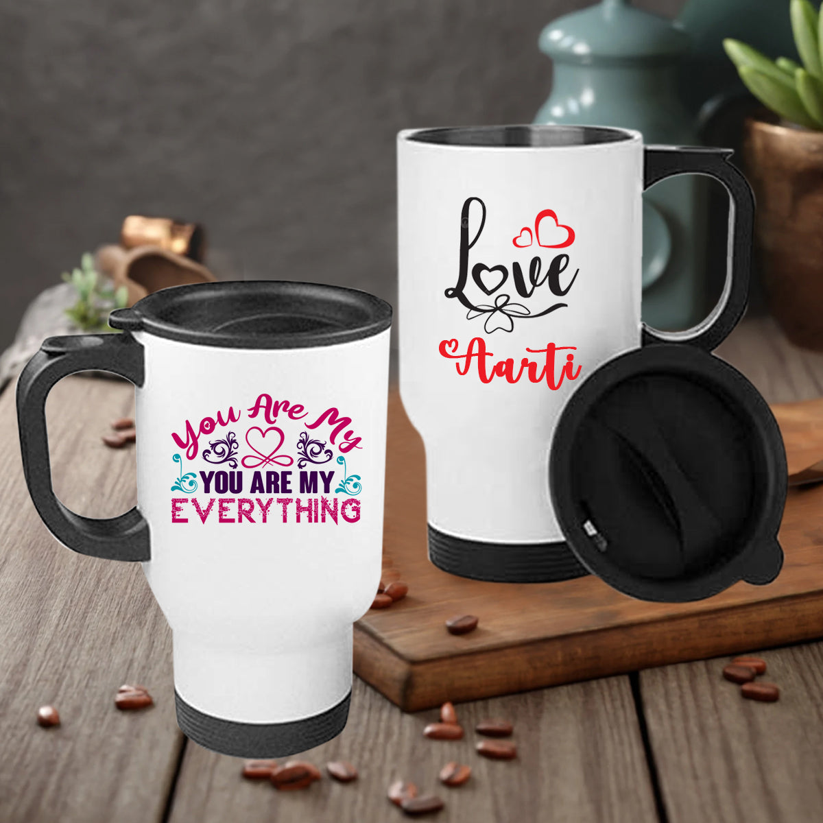 Showcase your travel mug in a car or during a road trip. Share a moment from your journey and express the joy of traveling with your loved one. Caption it with "Love is the best companion on the road. πβ€οΈ #RoadTripLove"