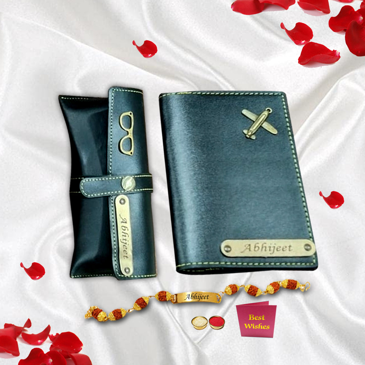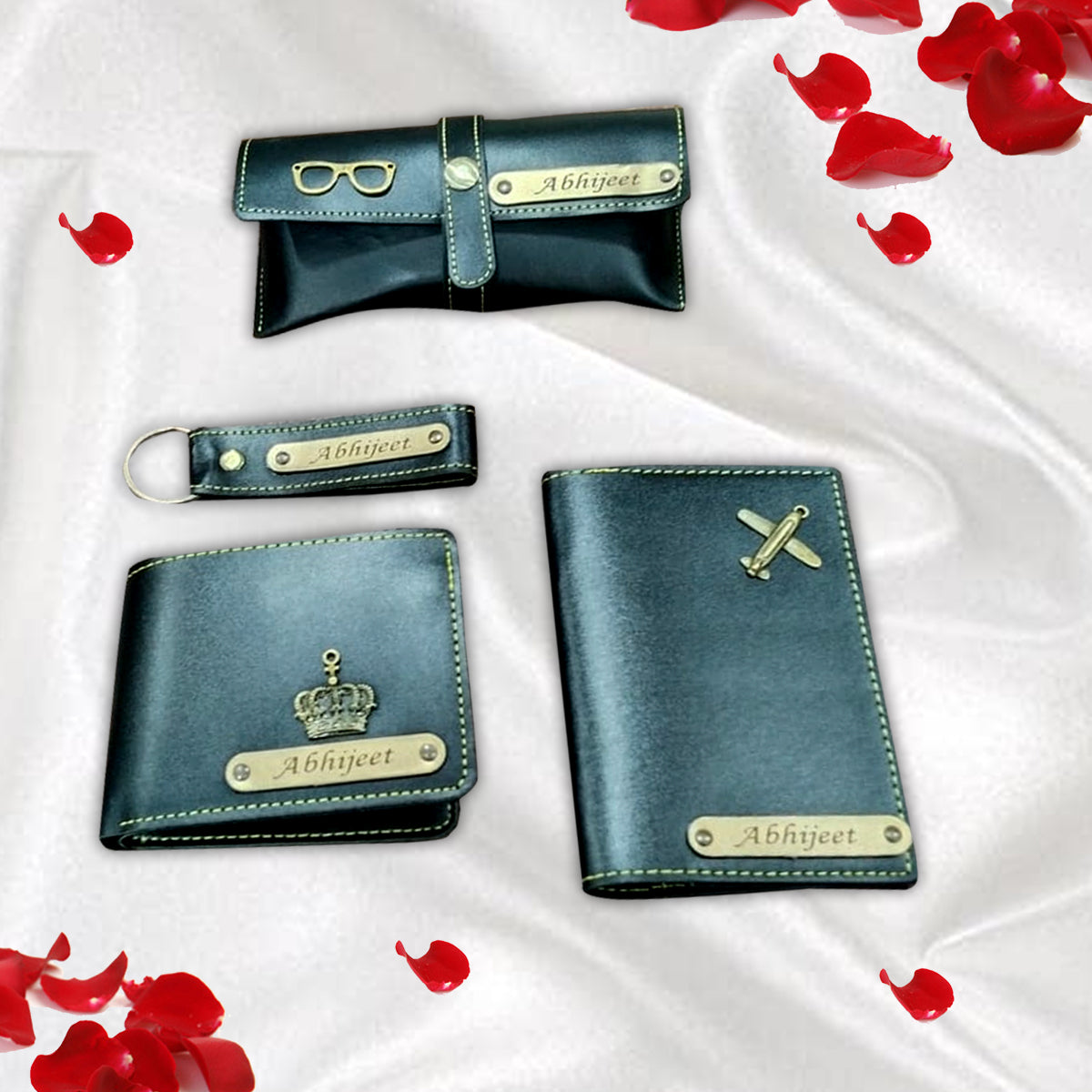 The combo set for the hamper includes a stylish and practical collection of essential accessories for everyday use, designed to keep your belongings organized and protected. Wallet- The wallet is crafted from high-quality, durable material, combining functionality with elegance with name engraved On it. Passport Cover - The passport cover is a must-have for frequent travelers or those planning exciting trips. It's designed to fit standard-sized passports and provides extra protection against wear and tear during travel. Goggle Cover - The goggle cover is a convenient accessory to protect your valuable sunglasses or prescription eyewear from scratches, dust, and accidental damage. It's made from soft, microfiber material that is gentle on the lenses. Keychain- The keychain is not only practical but also adds a touch of personalization to your everyday items. It is crafted from sturdy Synthetic leather with a secure keyring to hold all your important keys in one place.