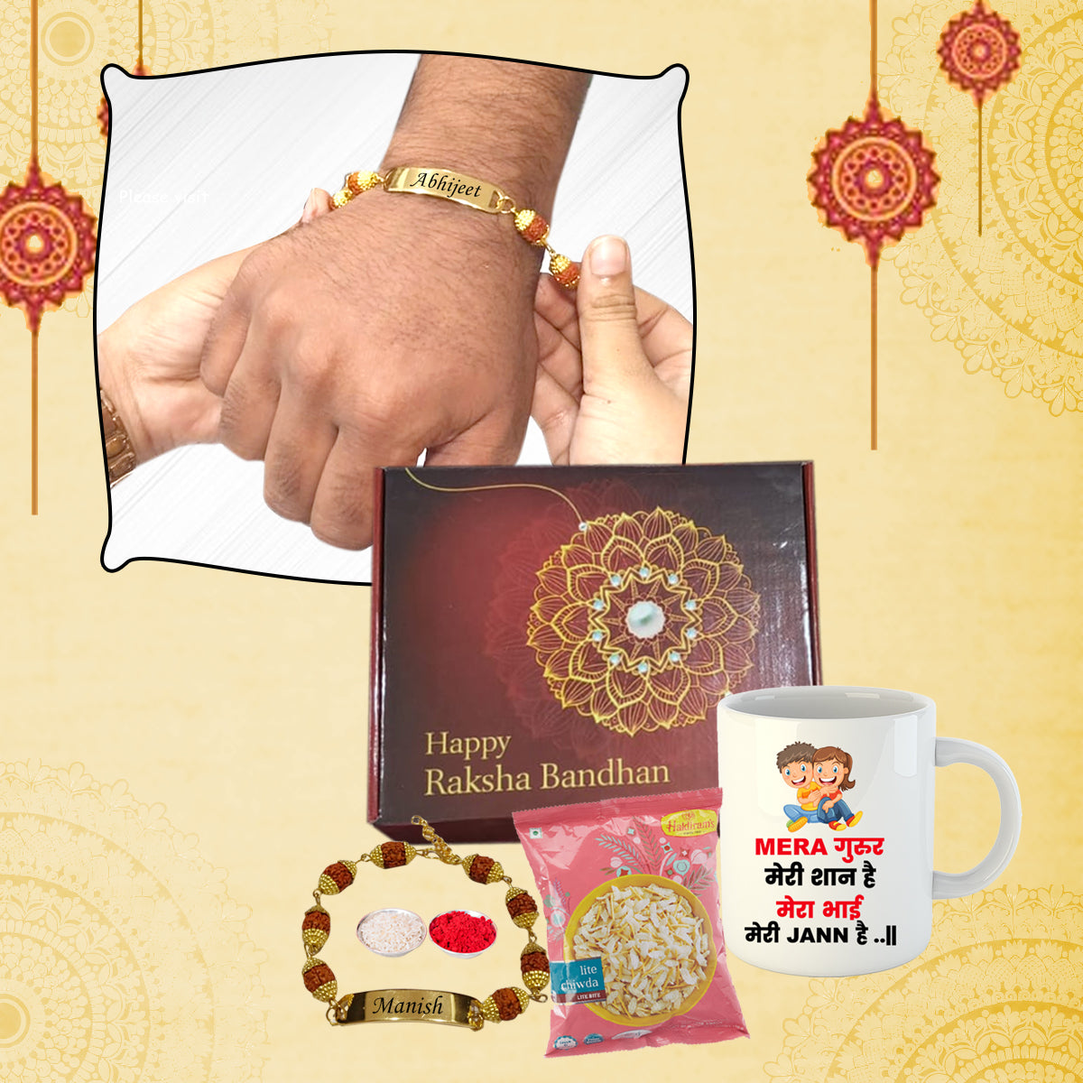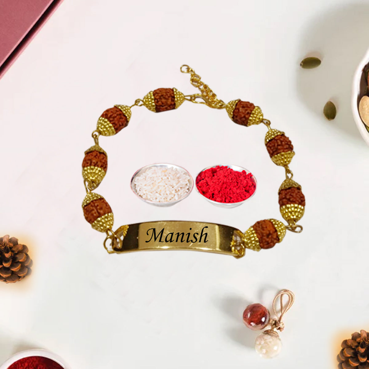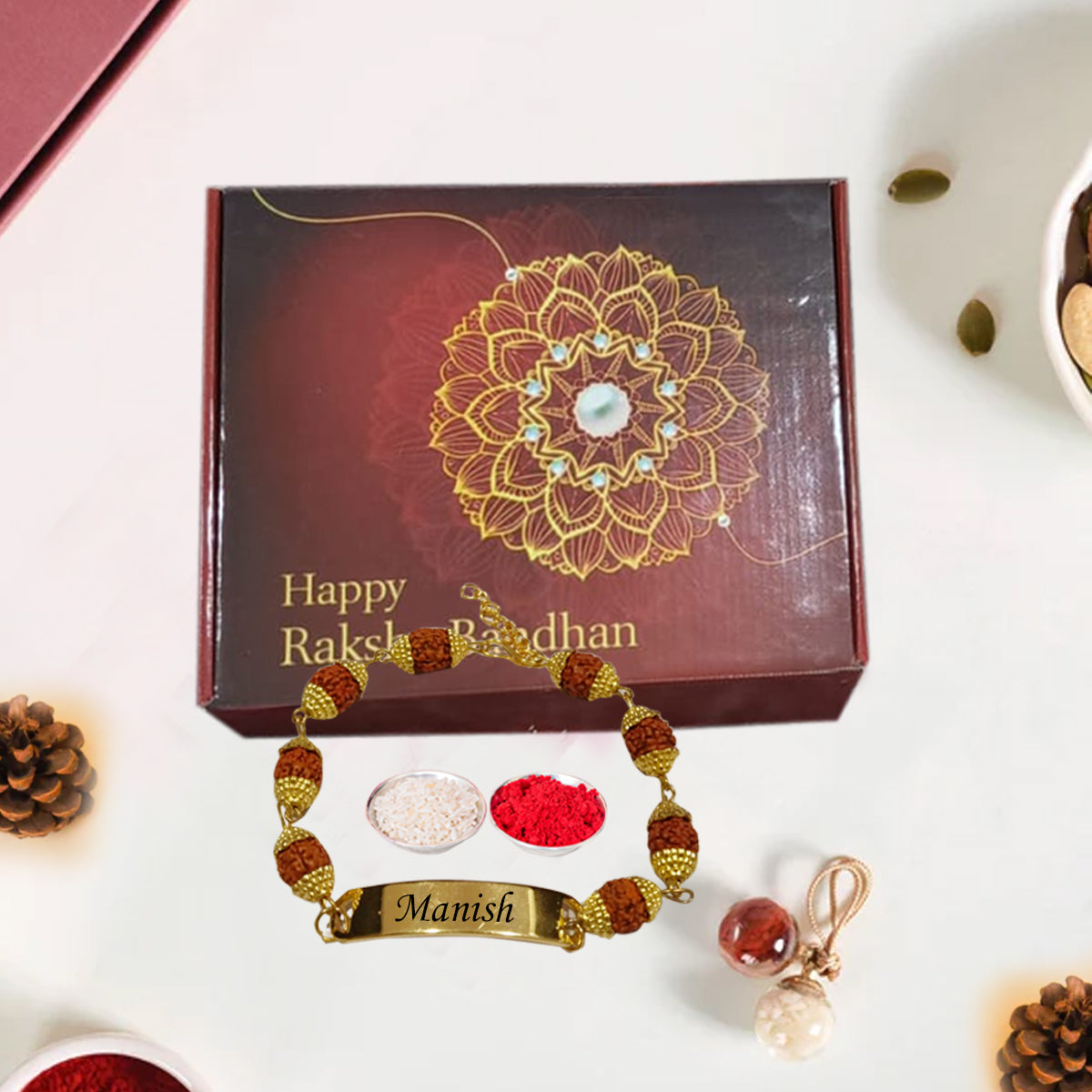- Rakhi: Chilaao personalized Rudraksh Rakhi with a golden metal plate is a beautiful and meaningful piece of Indian festival jewelry. It combines the sacred Rudraksh beads with an elegant golden metal plate, creating a unique and auspicious design. The metal plate is personalized with engravings with names, making it a truly special and unique rakhi for your brother.