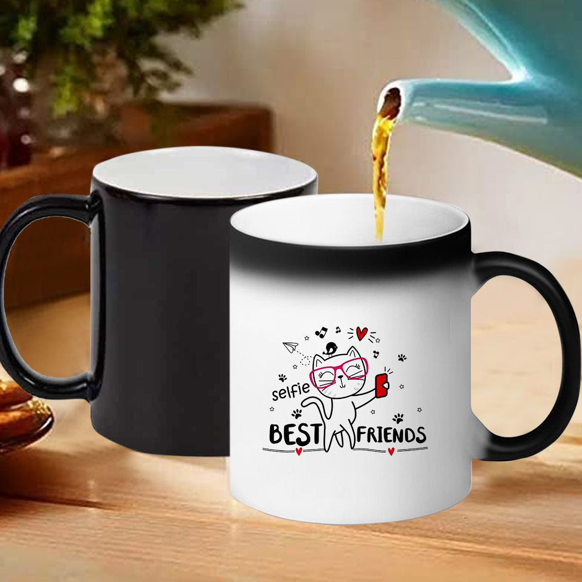 When your friend pours a hot beverage, such as coffee, tea, or hot chocolate, into the mug, an extraordinary transformation takes place. Like a magical spell, the black exterior of the mug starts to fade away, revealing a hidden design underneath. It could be a heartwarming message, a beautiful friendship quote, or even a personalized photo of you and your friend together.