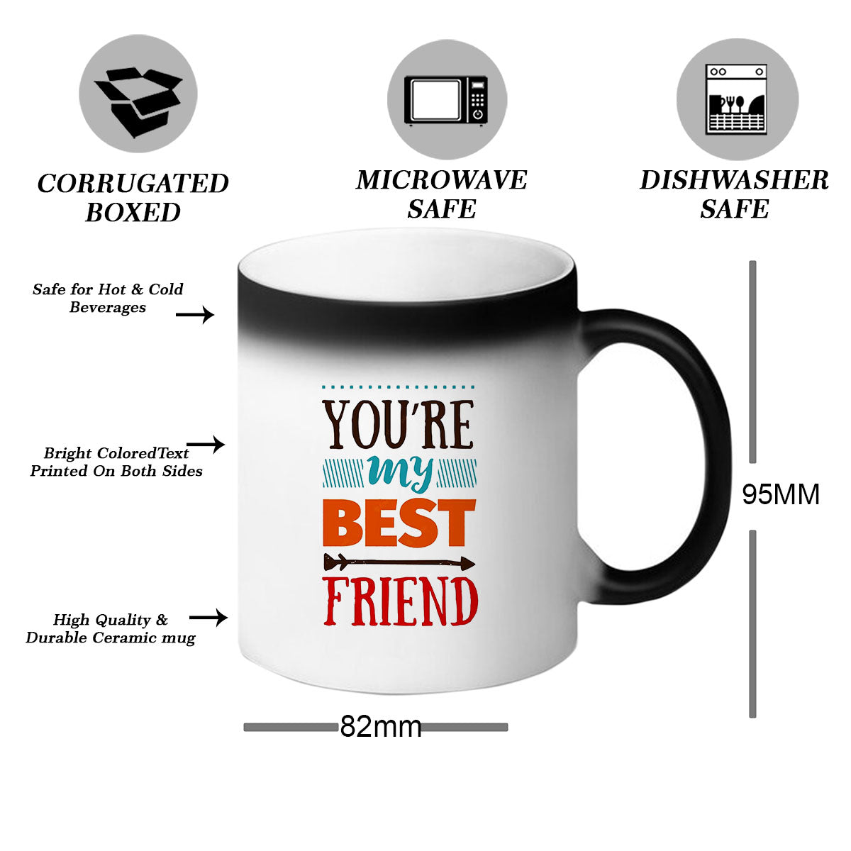 When your friend pours a hot beverage, such as coffee, tea, or hot chocolate, into the mug, an extraordinary transformation takes place. Like a magical spell, the black exterior of the mug starts to fade away, revealing a hidden design underneath. It could be a heartwarming message, a beautiful friendship quote, or even a personalized photo of you and your friend together.