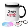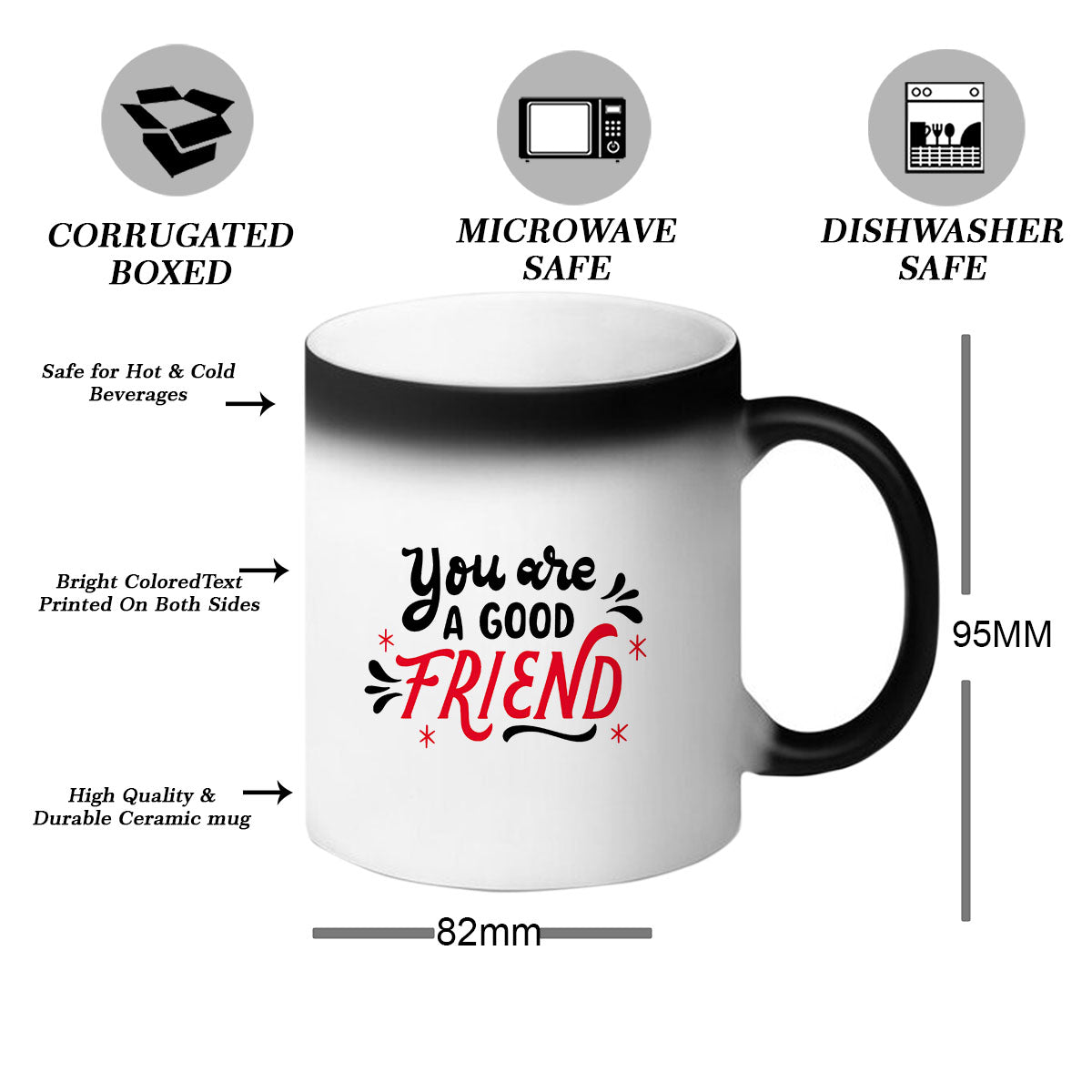 When your friend pours a hot beverage, such as coffee, tea, or hot chocolate, into the mug, an extraordinary transformation takes place. Like a magical spell, the black exterior of the mug starts to fade away, revealing a hidden design underneath. It could be a heartwarming message, a beautiful friendship quote, or even a personalized photo of you and your friend together.