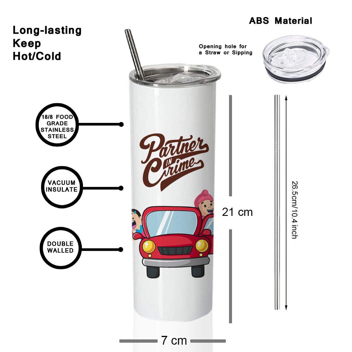 Unleash your style with our newly introduced Skinny tumbler. The sleek slim shape makes the bottle a star in itself. Double walled construction provides insulation to all your hot and cold liquids. The push on lid is attached by a rubber gasket making it both secure and easy to put on. Also allows you to sip directly or use the included steel straw accompanied by a straw cleaner. This tumbler is extremely versatile for any occasions and fits your interest. Use it to travel, to outdoor events and sports activities, personalize them for party favors and gifts, or just for everyday use. The unique, quirky and funny prints guarantee to bring smile to your loved ones. Gift it to your friends, mom, dad, brother, sister, colleagues, cousins, boyfriend, girlfriend. 100% stainless steel yet light weight. Eco-friendly and are designed using the sublimation technology with the finest quality inks. The prints are scratch resistant and do not fade or come out with time and use. The product is printed against your order. The actual print may vary a bit.